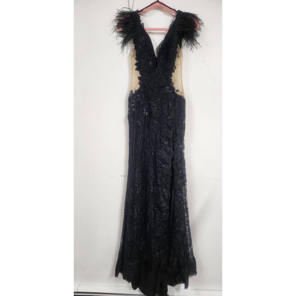 The compliments will keep coming when you step out in the unbeatably glam gown. Cut in a column silhouette with a daring high slit, the lace dress showcases rhinestones, floral embroidery, feathersand sexy cutouts. A sensual open back is the perfect complement to a gown that has it all.